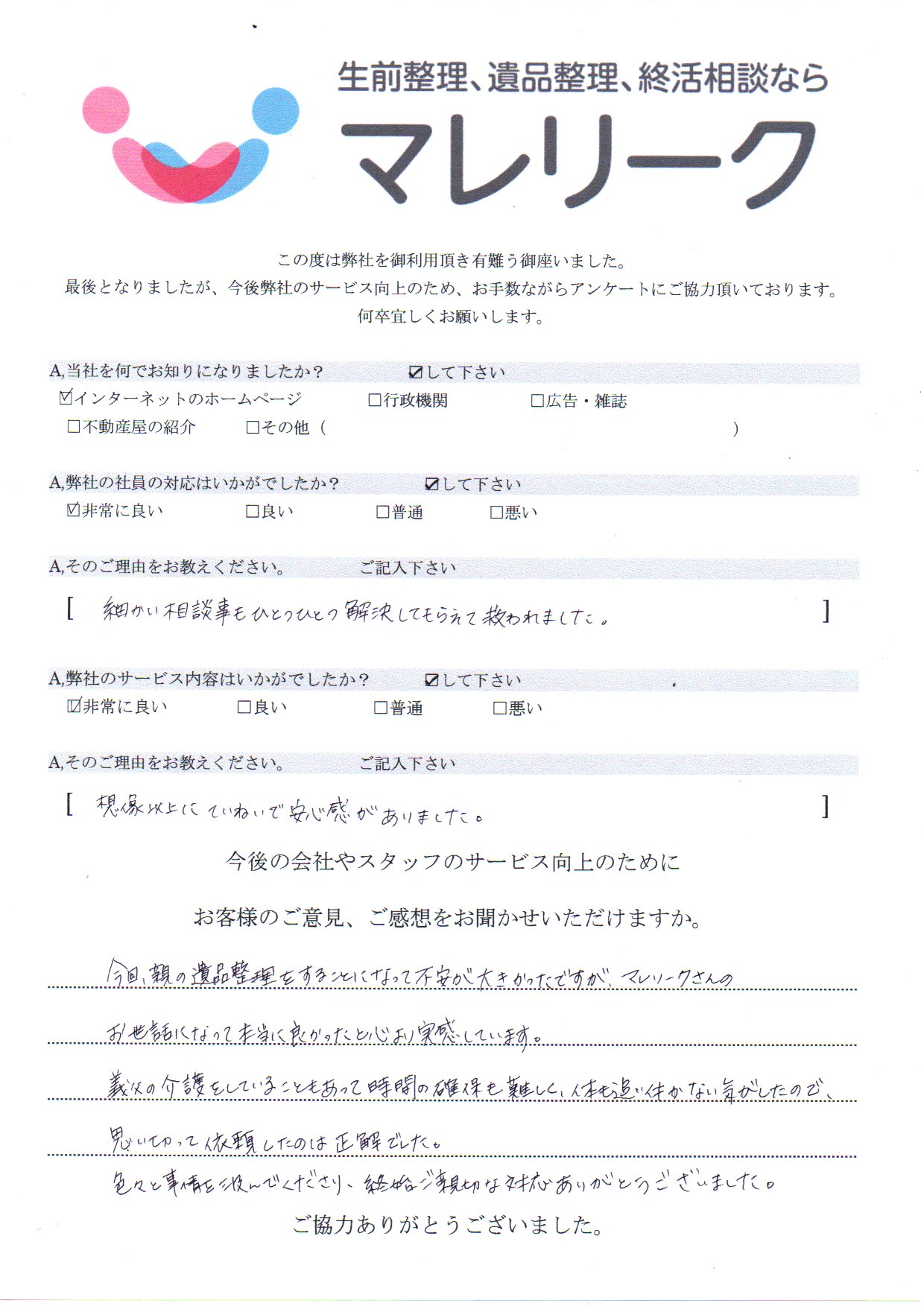 お客様のご意見、ご感想をお聞かせいただけますか。今回、親の遺品整理をすることになって不安が大きかったですが、マレリークさんのお世話になって本当に良かったと心より実感しています。