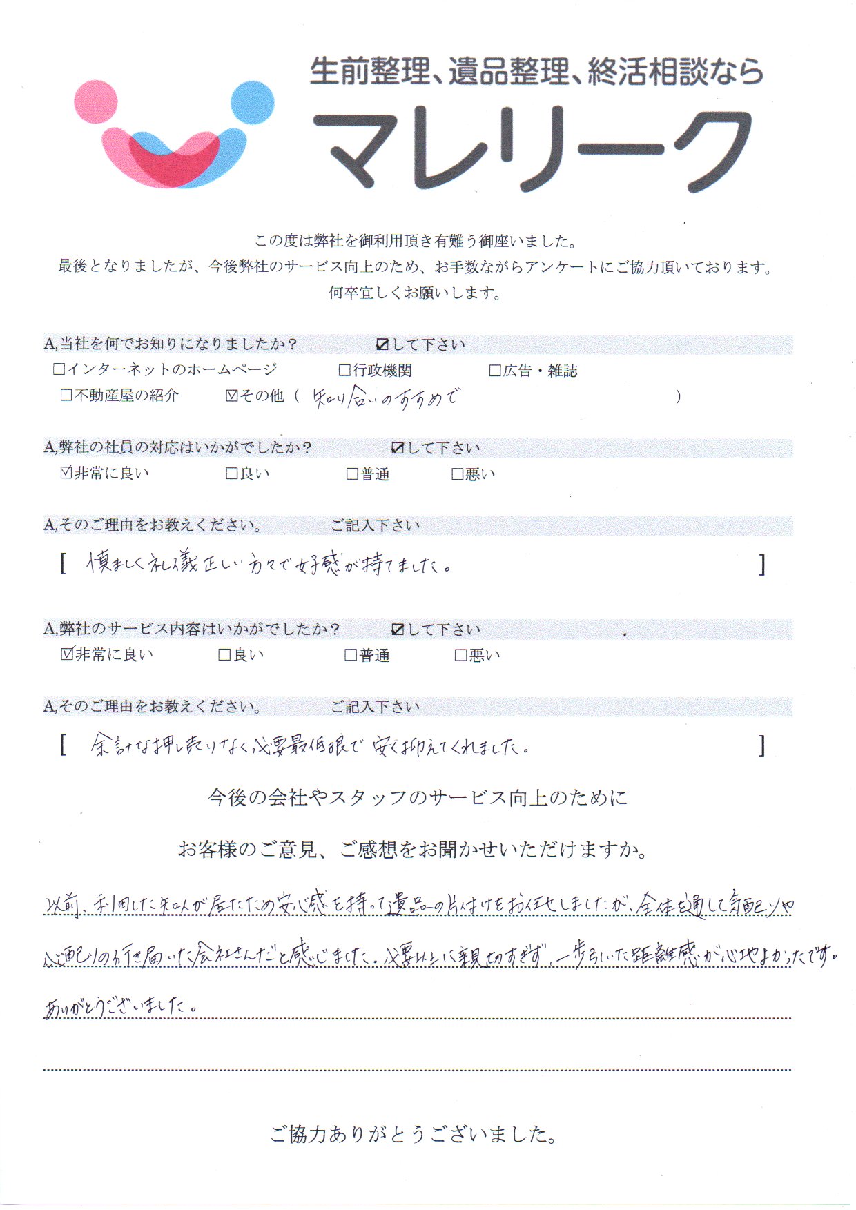 お客様のご意見、ご感想をお聞かせいただけますか。以前、利用した知人が居たため安心感を持って遺品の片付けをお任せしましたが、全体を通して気配りや心配りの行き届いた会社さんだと感じました。