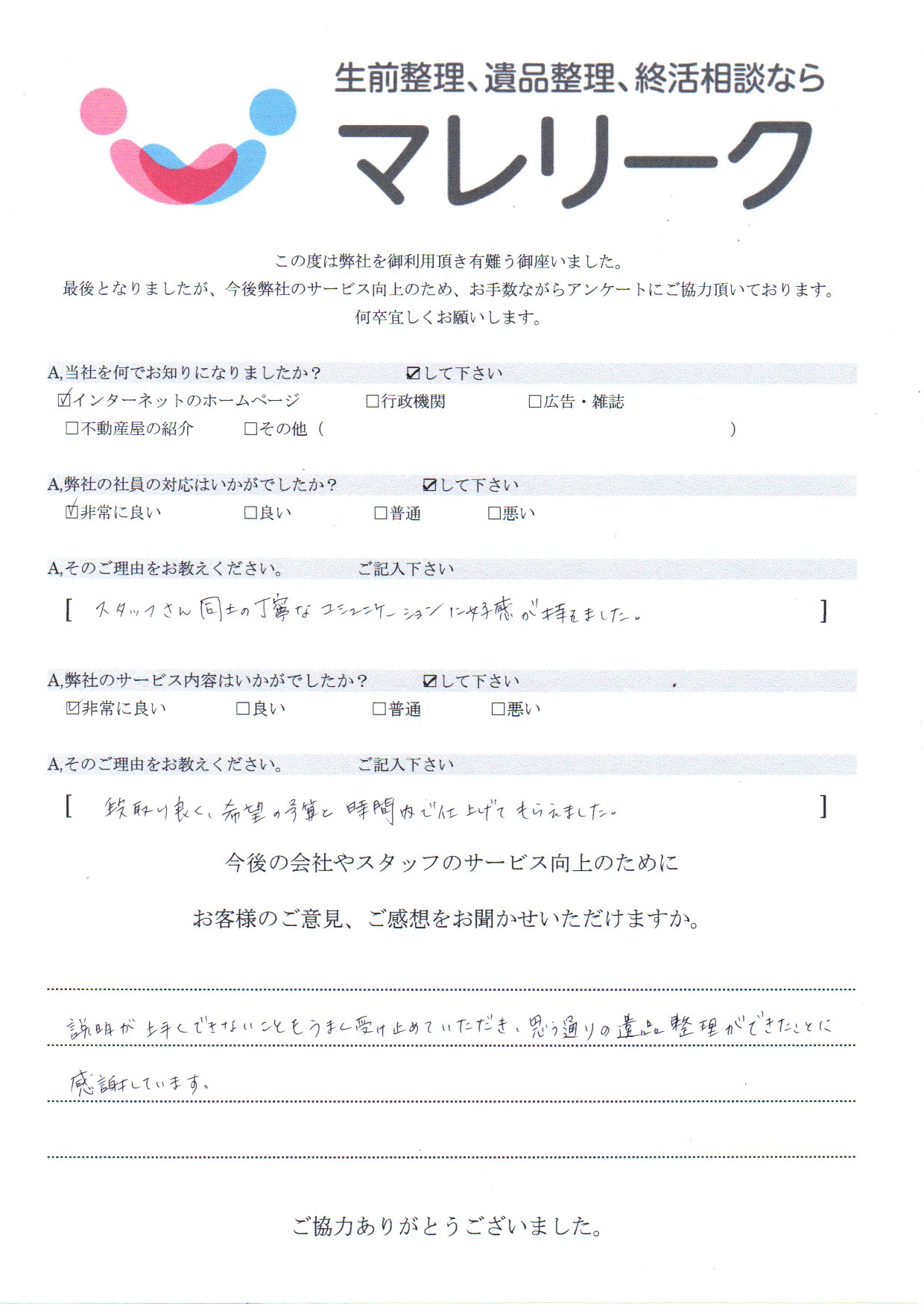 お客様のご意見、ご感想をお聞かせいただけますか。説明が上手くできないこともうまく受け止めていただき、思う通りの遺品整理ができたことに感謝しています。