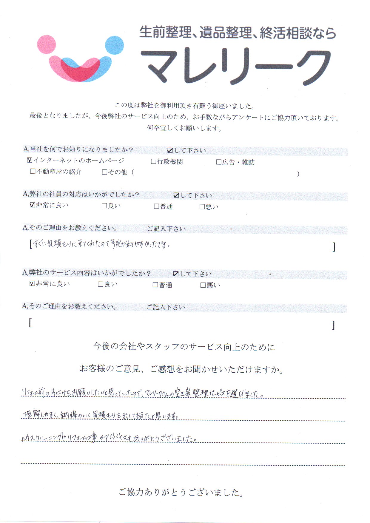お客様のご意見、ご感想をお聞かせいただけますか。リフォーム前の片付けをお願いしたいと思っていたので、マレリークさんの空き家整理サービスを選びました。