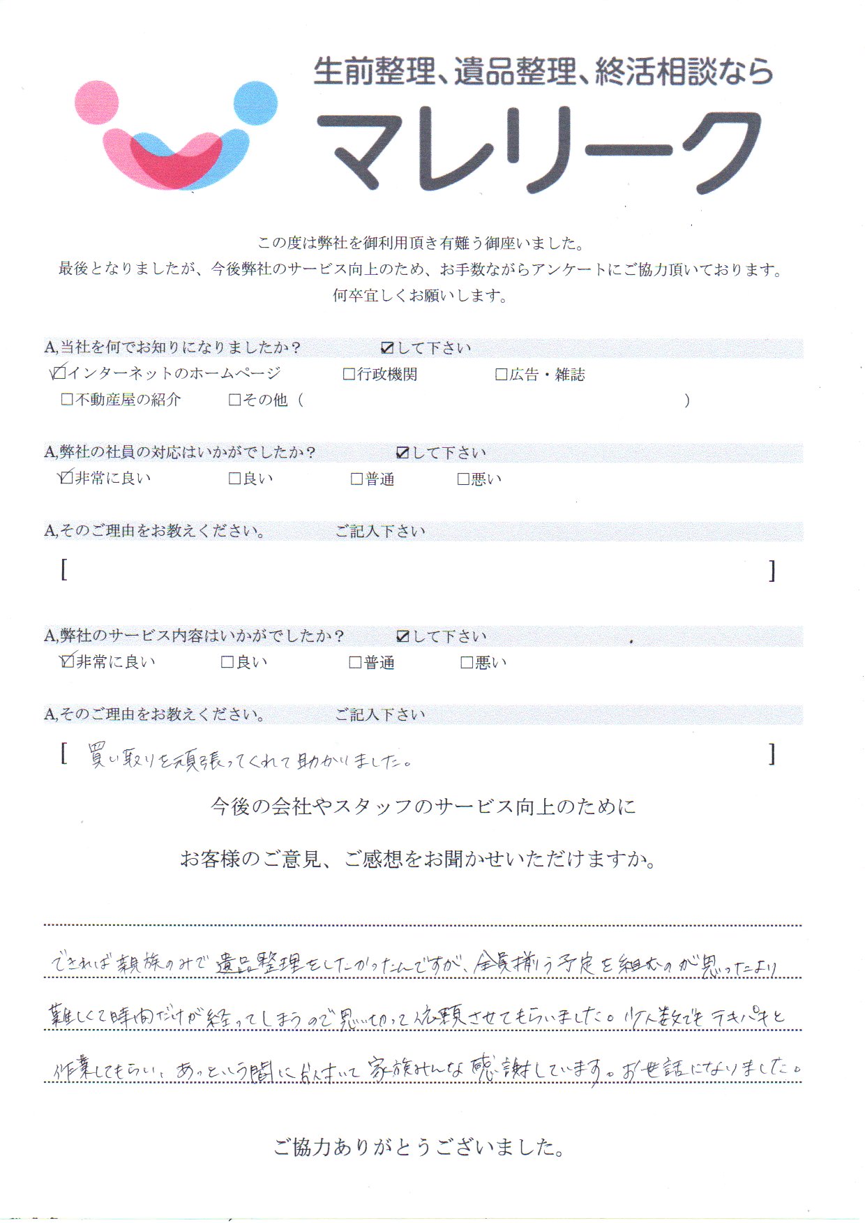 お客様のご意見、ご感想をお聞かせいただけますか。できれば親族のみで遺品整理をしたかったんですが、全員揃う予定を組むのが思ったより難しくて時間だけが経ってしまうので思い切って依頼させてもらいました。