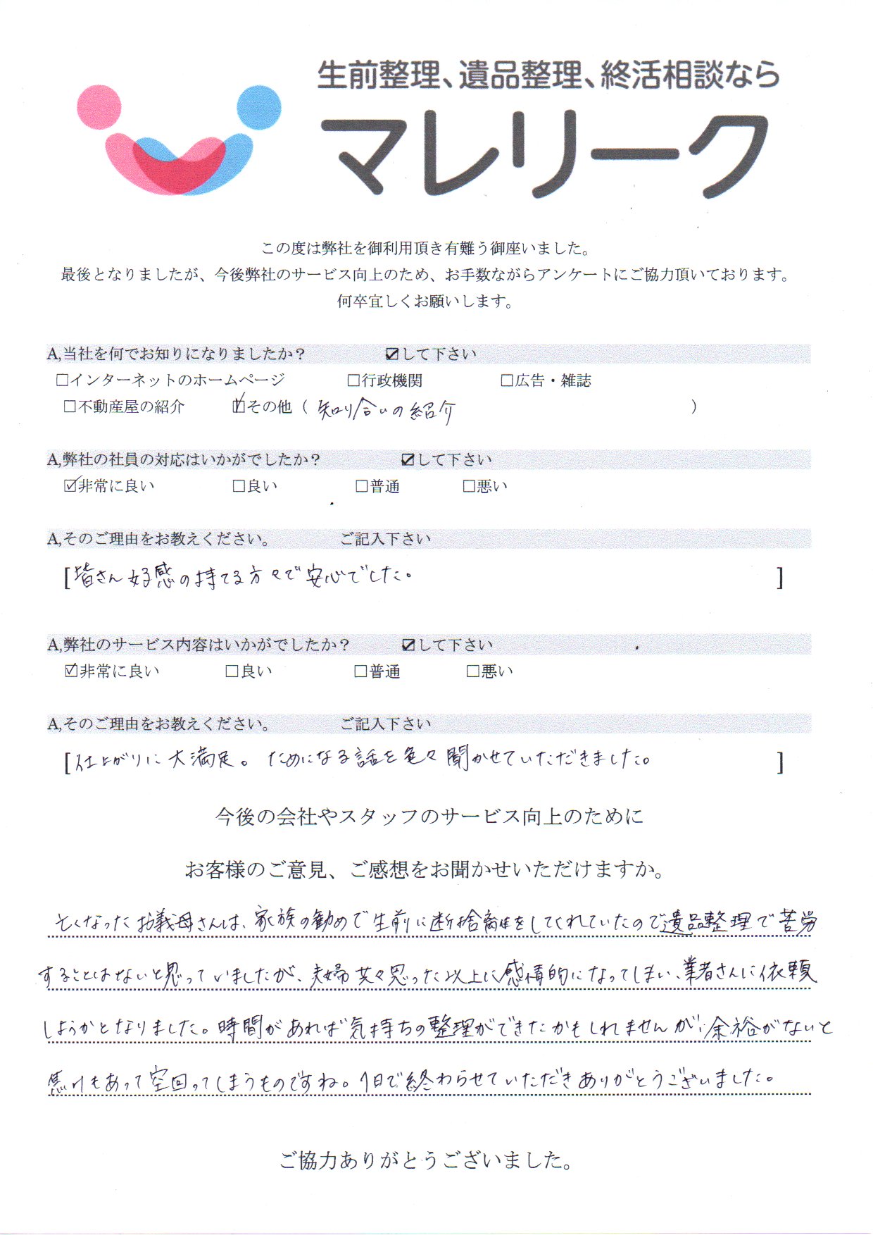 お客様のご意見、ご感想をお聞かせいただけますか。亡くなったお義母さんは、家族の勧めで生前に断捨離をしてくれていたので遺品整理で苦労することはないと思っていましたが、夫婦共々思った以上に感情的になってしまい、業者さんに依頼しようかとなりました。