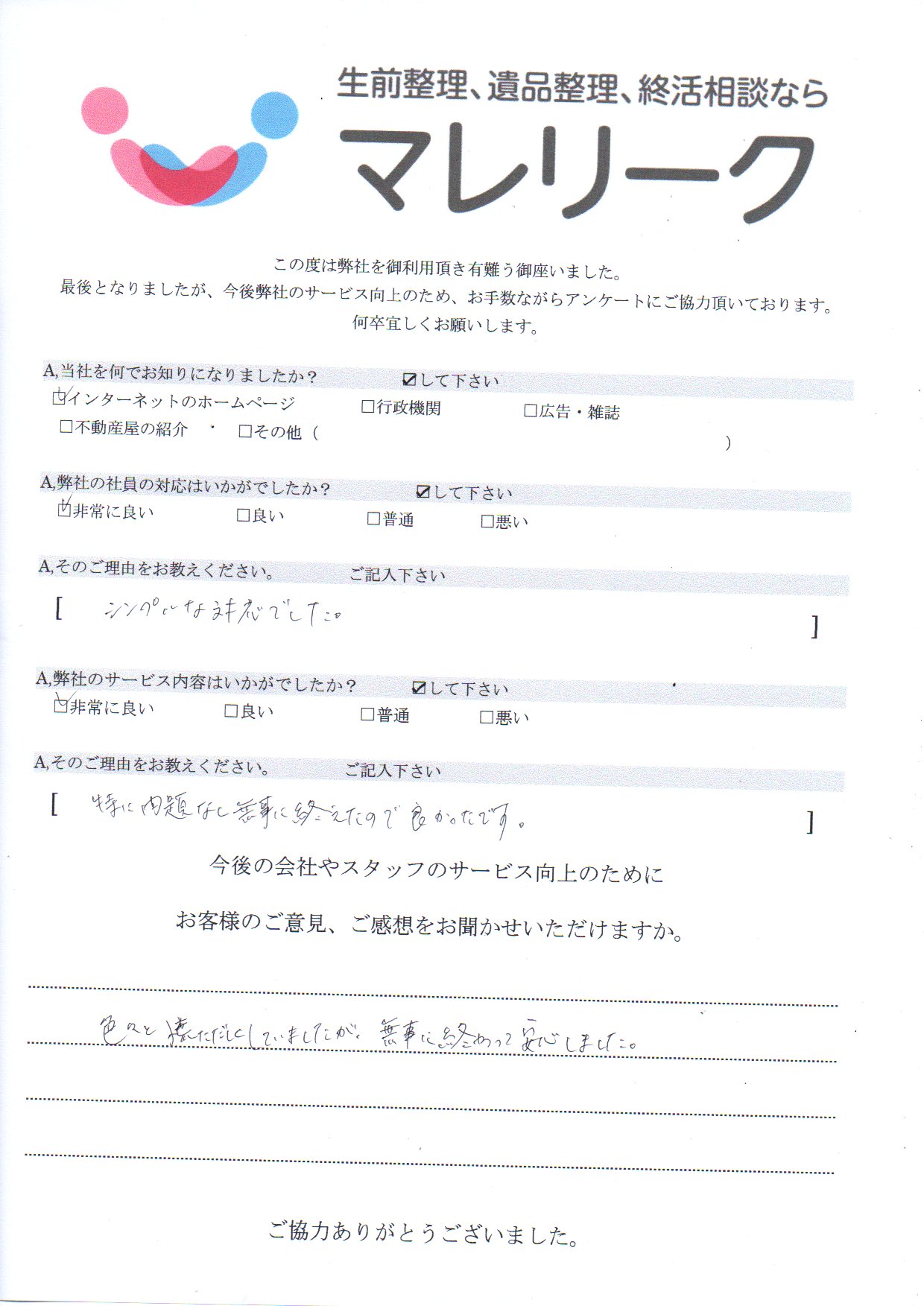 お客様のご意見、ご感想をお聞かせいただけますか。色々と慌ただしくしていましたが無事に終わって安心しました。