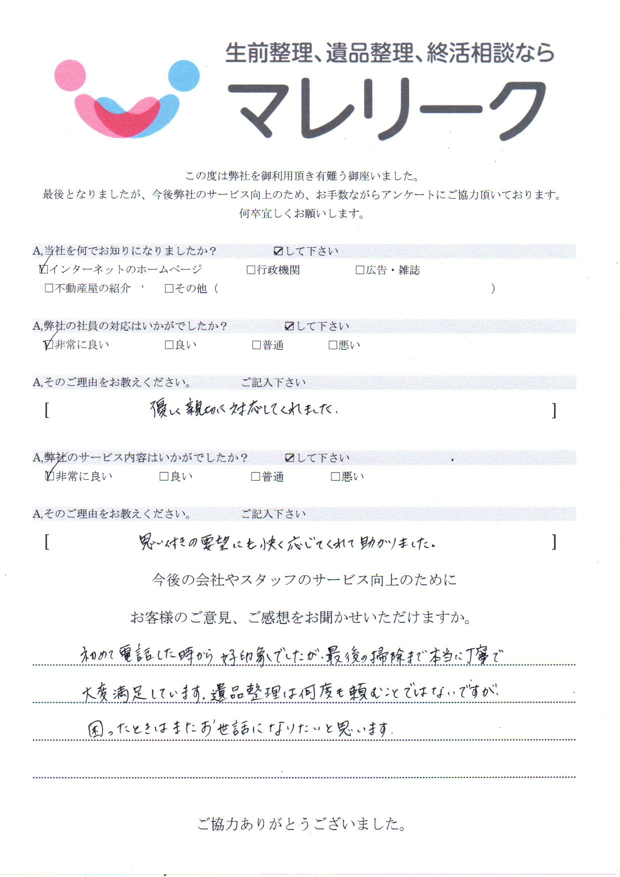 お客様のご意見、ご感想をお聞かせいただけますか。初めて電話した時から好印象でしたが、最後の掃除まで本当に丁寧で大変満足しています。