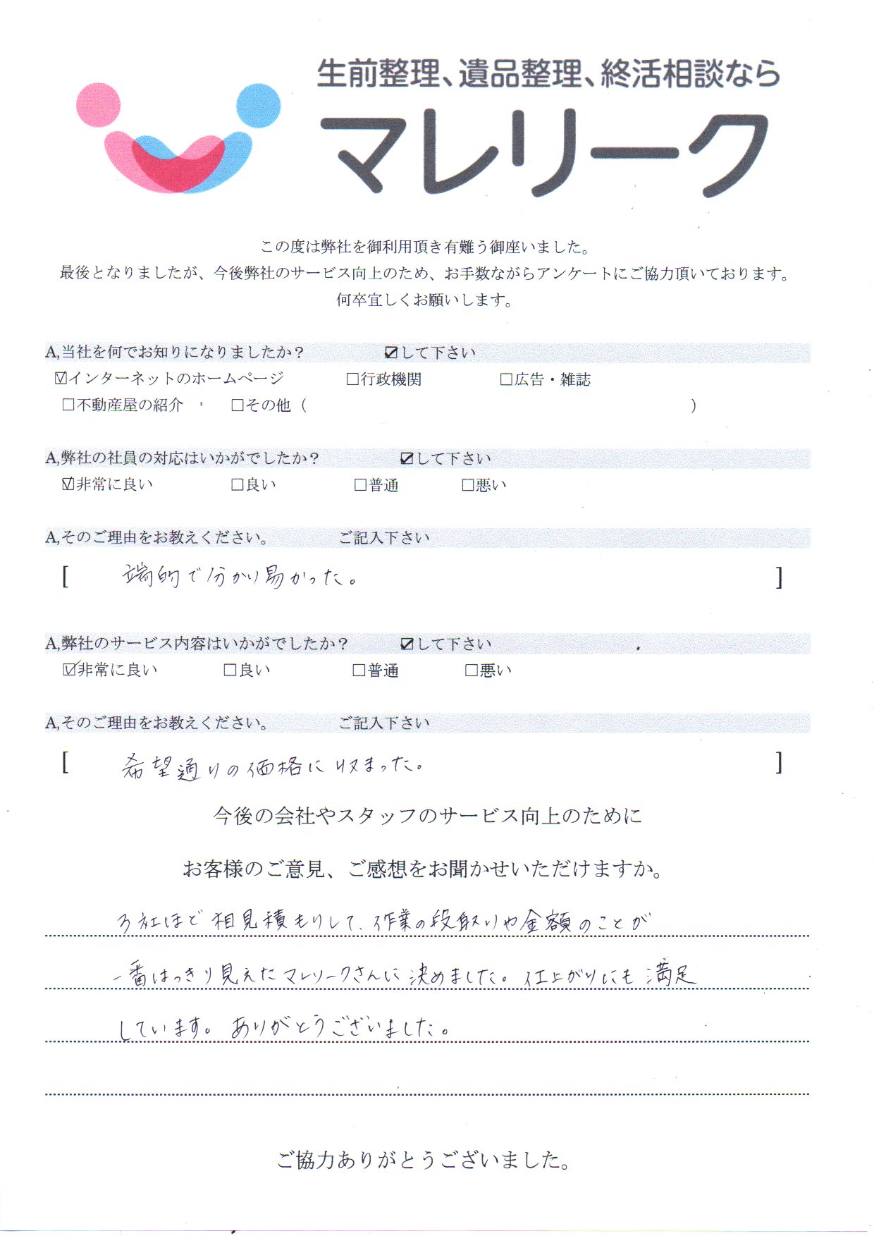 | 利用したサービス | :遺品整理,遺品買取,不用品回収 |